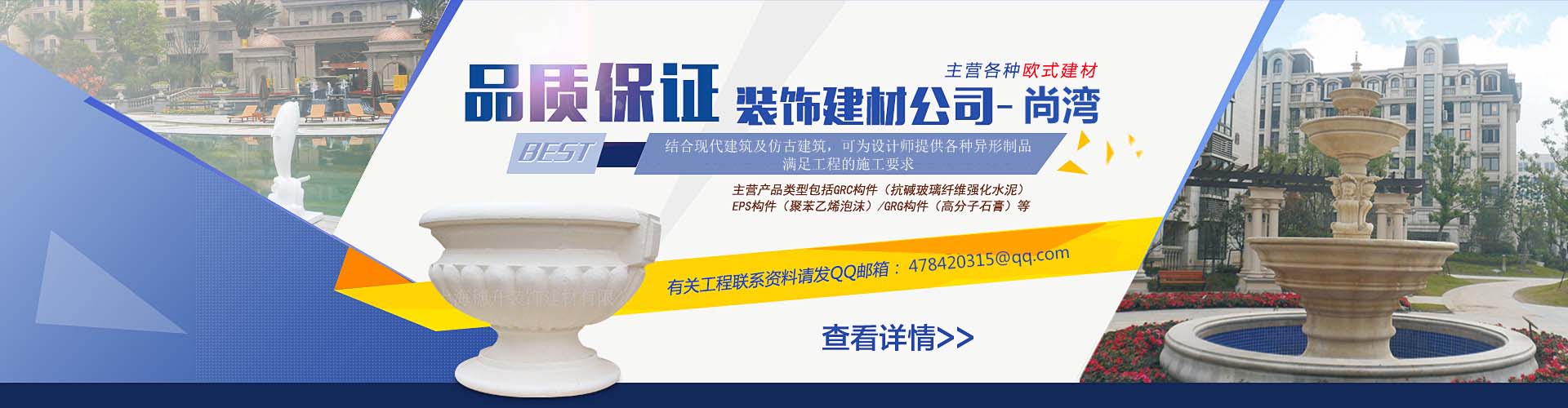 上海尚灣建材有限公司是一家集室內(nèi)外設(shè)計(jì)、生產(chǎn)、制作、安裝、GRG構(gòu)件、GRC歐式構(gòu)件、EPS構(gòu)件、浮雕、雕塑、假山、假樹、砂巖工藝品、玻璃鋼工藝品的專業(yè)生產(chǎn)廠家。根據(jù)甲方提供的設(shè)計(jì)圖紙,按圖紙加工各種材料的GRC歐式構(gòu)件,EPS線條、室內(nèi)外砂巖、玻璃鋼浮雕及圓雕、藝術(shù)圍欄、現(xiàn)場(chǎng)安裝施工、真石漆、乳膠漆噴涂等圍繞整個(gè)建筑裝飾工程的全方位施工,并且結(jié)合現(xiàn)代建筑及仿古建筑,可為設(shè)計(jì)師提供各種異形制品,滿足工程的施工要求。